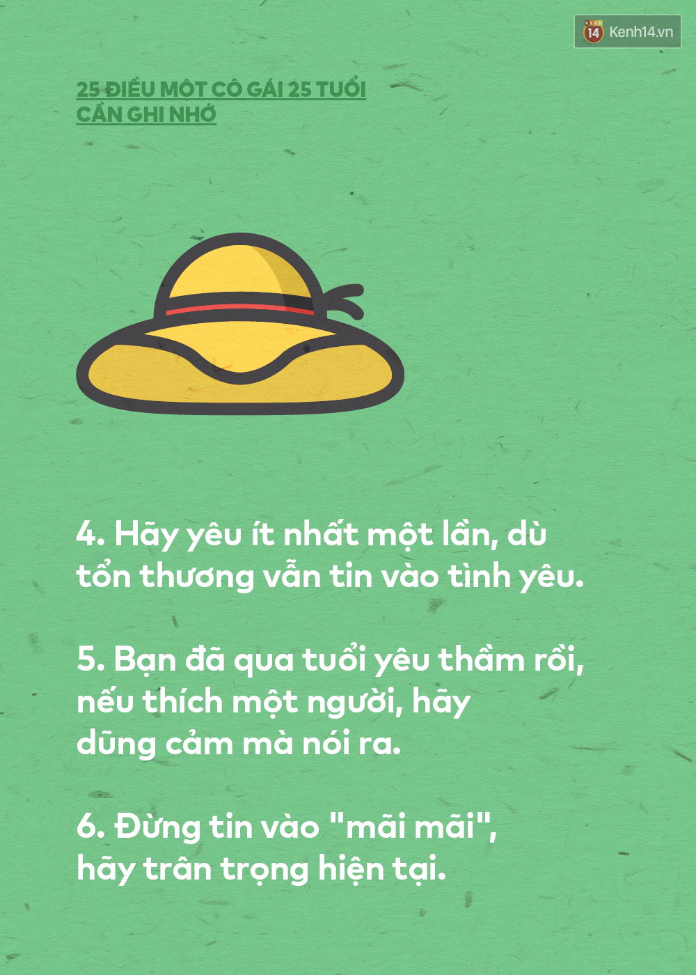 [SIZE=4]Hãy để tuổi 25 của bạn hoàn hảo hơn từ từng chi tiết nhỏ, hãy trân trọng và yêu thương bạn trước khi mong muốn ai đó tới và che chở bạn. Đơn giản lắm, học nấu ăn cho bản thân, không thức khuya nữa, và không buồn thương vô cớ, không để nước mắt rơi nhiều…[/SIZE][/SIZE]