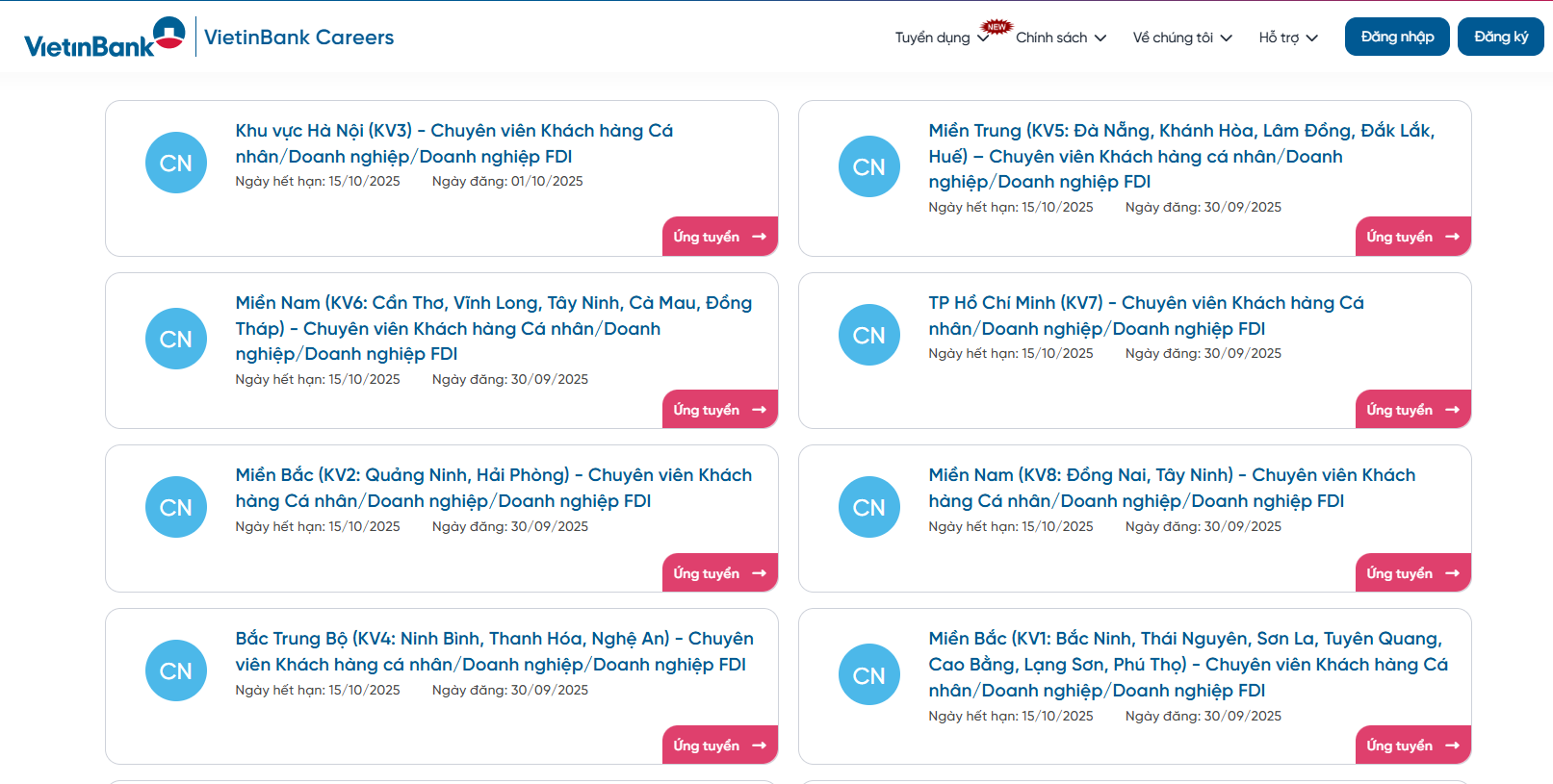 - VietinBank chỉ tuyển dụng với các ứng viên tốt nghiệp Đại học hệ chính quy, tập trung, dài hạn tại các trường đại học trở lên (không bao gồm hình thức học liên thông lên đại học, tại chức, hệ vừa học vừa làm, văn bằng 2).