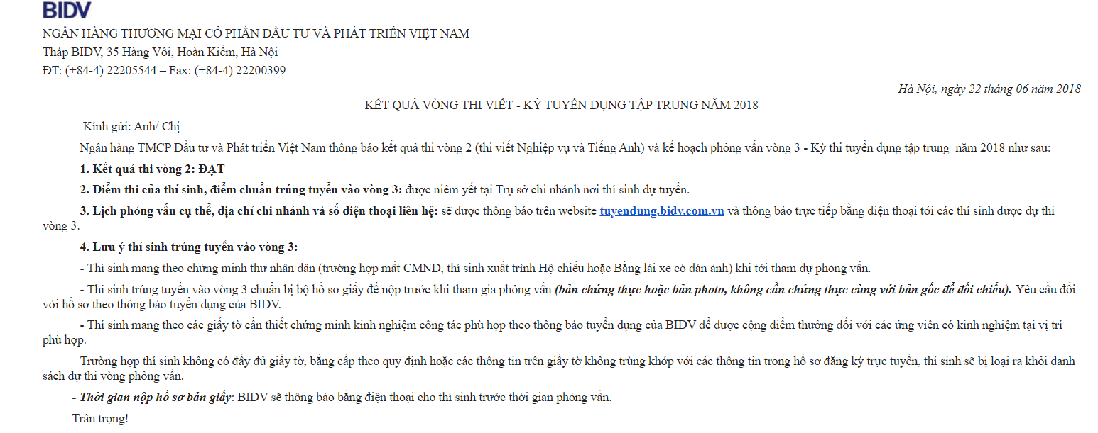 CHÚ Ý: Điểm khác biệt Quan trọng nhất trong thi tuyển của BIDV, đó là áp dụng quy định về điểm “liệt”. Theo đó, BIDV yêu cầu tất cả các môn thi (Nghiệp vụ & Tiếng Anh) đều có điểm sàn tối thiểu là 30 điểm/môn.