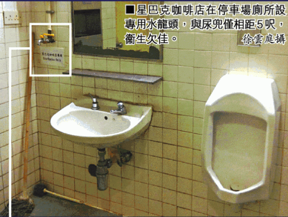 Theo Apple Daily, hàng ngày, một nhân viên Starbucks sẽ đẩy một chiếc xe vào nhà vệ sinh nam trong một gara đậu xe gần đó, đổ đầy nước vào và đẩy chiếc xe trở lại Starbucks. Tại đây ‘nước nhà vệ sinh’ sẽ được lọc. Việc này diễn ra 70 lần mỗi ngày. Người ta dùng nước ở nhà vệ sinh vì không có nguồn nước nào khác ở gần đó.