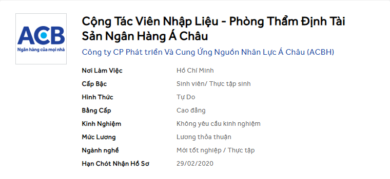 [li]Sinh viên năm cuối các trường Cao đẳng, Đại học.[/li][li]Khả năng đánh máy nhanh và chính xác (tối thiểu 60 từ/phút).[/li][li]Khả năng làm việc độc lập và chịu được áp lực.[/li][li]Khả năng làm việc nhóm và phối hợp với các đồng nghiệp ở các đơn vị chức năng khác nhau.[/li][li]Nhanh nhẹn, đúng giờ.[/li][li]Chăm chỉ, cẩn thận, trung thực, tinh thần trách nhiệm.[/li][li]Hòa đồng, cộng tác.[/li][/ul]