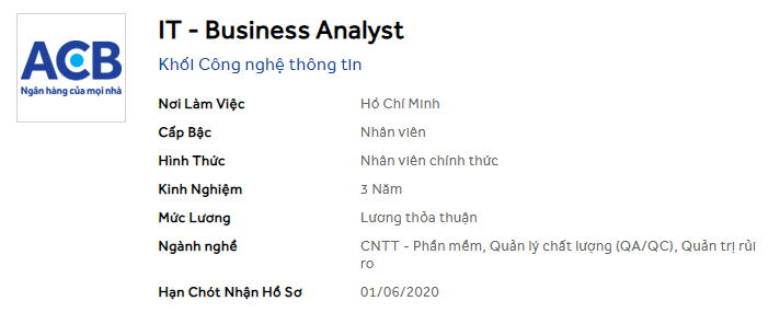 [li]Bachelor degree preferably in Computer Science or Business Information System[/li][li]Obtaining IT knowledge-base[/li][li]Fluent English and Vietnamese to be able to communicate directly with customers[/li][li]At least 3 years of working experience of which 2 years in analyzing requirements[/li][li]Basic experience in programming languages[/li][li]Basic knowledge on database such as database schema and simple SQL query[/li][li]Knowledge of testing approaches and techniques[/li][li]General understanding and experience of business processes as well as an interest to understand a broad range of business models and needs[/li][/ul]