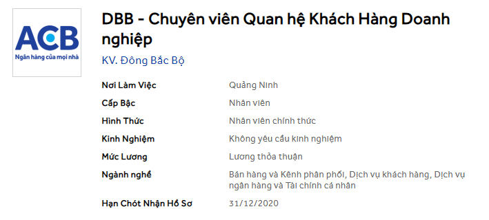 [li]Chính sách lương, thưởng cạnh tranh trên thị trường (Thưởng theo hiệu suất kinh doanh và thưởng định kỳ).[/li][li]Cơ hội được đào tạo, phát triển về chuyên môn, nghiệp vụ và huấn luyện chuyên sâu tại Trung tâm học tập - ACB Learning Hub.[/li][li]Lộ trình thăng tiến minh bạch và rõ ràng (Đánh giá và đề xuất định kỳ 6 tháng/lần tùy vào năng lực).[/li](Nhân viên QHKHDN => Chuyên viên QHKHDN => Giám đốc QHKHDN => Giám đốc QHKHDN cao cấp => Trưởng phòng/Trưởng bộ phận KHDN => Giám đốc CN/PGD).