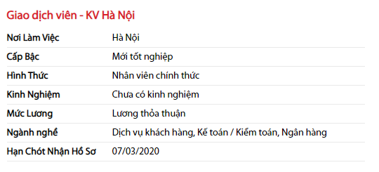 [li]Nam/Nữ, cao từ 1m60 trở lên ngoại hình ưa nhìn.[/li][li]Tốt nghiệp Đại học chính quy trở lên chuyên ngành kế toán, kiểm toán, kinh tế, thương mại, tài chính ngân hàng[/li][li]Ưu tiên tiếng Anh giao tiếp tốt.[/li][li]Ưu tiên những người có kinh nghiệm về kế toán hoặc dịch vụ khách hàng;[/li][li]Ưu tiên biết sử dụng T24 và phần mềm quản lý khách hàng (nếu có).[/li][li]Kỹ năng: Chăm sóc, phục vụ khách hàng; Giao tiếp; Xử lý tình huống.[/li][/ul]