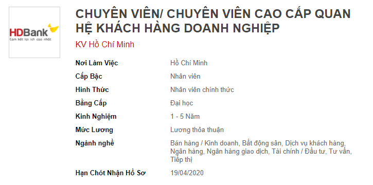[li]Chủ động thực hiện tìm kiếm và tiếp cận đối tượng Khách hàng Doanh nghiệp (SME) để xây dựng nguồn Khách hàng SME tiềm năng. Tích cực tham gia các hội thảo, hội nghị doanh nghiệp SME do HDBank tổ chức, tài trợ[/li][li]Tìm hiểu nhu cầu của Khách hàng SME tiềm năng. Giới thiệu, tư vấn các sản phẩm/dịch vụ thích hợp. Mục tiêu phát triển thành Khách hàng SME mới của HDBank[/li][li]Xây dựng và duy trì mối quan hệ tốt với các Khách hàng SME trong danh mục quản lý. Tìm kiếm cơ hội, nhằm đáp ứng tối đa các nhu cầu của doanh nghiệp SME: Tiền gởi, Vay vốn, Tài khoản thanh toán, Ngân hàng điện tử, Quản lý tiền mặt,…[/li][li]Trực tiếp thực hiện toàn bộ quy trình bán hàng: thu thập thông tin khách hàng, xử lý hồ sơ theo quy trình nghiệp vụ HDBank, đại diện ngân hàng trao đổi thông tin trong quá trình bán hàng, hướng dẫn khách hàng sử dụng sản phẩm/dịch vụ, hoạt động sau bán hàng (đảm bảo tình trạng giao dịch của các tài khoản, dịch vụ theo đúng quy định của HDBank, pháp luật)[/li][li]Linh hoạt, uyển chuyển trong hoạt động bán hàng để hoàn thành mục tiêu kinh doanh (KPI)[/li][li]Tham gia các khóa học nghiệp vụ tân tuyển, các chương trình đào tạo nâng cao theo nhu cầu công việc[/li][li]Thực hiện các nhiệm vụ khác theo phân công của cấp quản lý trực tiếp[/li][/ul]