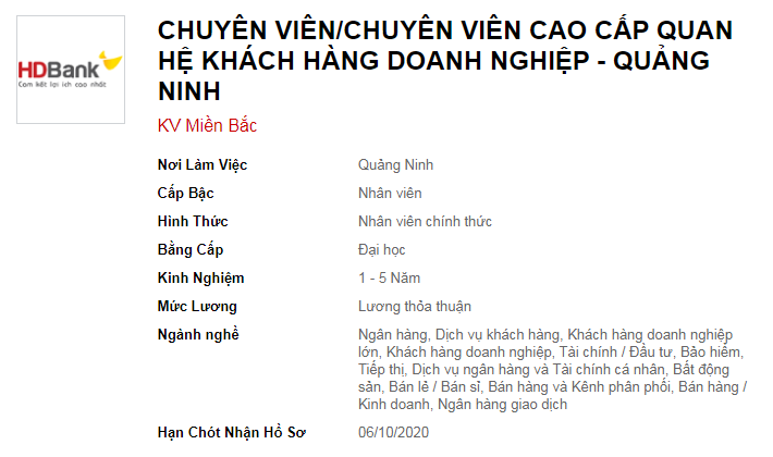 [li]Tốt nghiệp đại học các chuyên ngành kinh tế: Tài chính, Ngân hàng, QTKD, Kế toán,…[/li][li]Có kiến thức về nghiệp vụ tín dụng ngân hàng, các quy định của Ngân hàng Nhà nước và Pháp luật liên quan đến hoạt động kinh doanh ngân hàng (mảng Khách hàng Doanh nghiệp)[/li][li]Kỹ năng: bán hàng, giao tiếp, thuyết trình, đàm phán và thương lượng[/li][li]Tố chất: thích công tác bán hàng, năng động, làm việc độc lập, chủ động trong công việc, tuân thủ kỷ luật, chịu học hỏi, tiếp thu cái mới[/li][li]Sử dụng thành thạo vi tính văn phòng[/li][li]Ngoại ngữ (Anh/Hoa/Nhật): có khả năng giao tiếp là một lợi thế[/li][/ul]