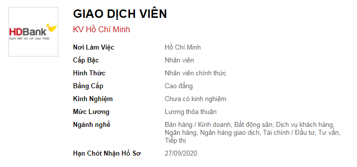 [li]Trình độ chuyên môn: Tốt nghiệp Cao đẳng trở lên các ngành Kinh tế, Kế toán, Tài chính, Ngân hàng, QTKD, Tiếng Anh thương mại… hoặc các chuyên ngành thuộc khối ngành Kinh tế.[/li][li]Kỹ năng: Kỹ năng giao tiếp, tư vấn khách hàng tốt, kỹ năng giải quyết vấn đề, quản lý thời gian, chăm sóc khách hàng, có khả năng làm việc độc lập.[/li][li]Giới tính: Nam/Nữ[/li][li]Yêu cầu về ngoại hình: Ngoại hình ưa nhìn, Nữ: chiều cao từ 1m60, Nam: chiều cao từ 1m65[/li][li]Tuổi: từ 26 trở xuống.[/li][/ul]