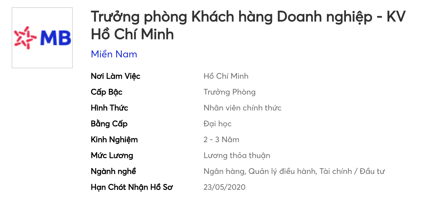 [li]Cử nhân chuyên ngành Kinh tế, Tài chính - Ngân hàng[/li][li]TOEIC 500 trở lên hoặc chứng chỉ tương đương[/li][li]Tối thiểu 1 năm kinh nghiệm tại vị trí Trưởng phòng/Phó phòng Kinh doanh và tổi thiểu 03 năm làm việc ở vị trí phát triển khách hàng doanh nghiệp[/li][li]Hiểu biết về hoạt động kinh doanh Tài chính - Tiền tệ - Ngân hàng tại địa bàn[/li][/ul]