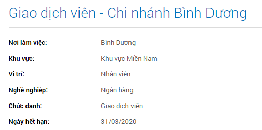 [li]Tốt nghiệp Cao đẳng/Đại học[/li][li]Nắm vững nghiệp vụ kế toán, hiểu biết dịch vụ thanh toán trong ngân hàng.[/li][li]Ưu tiên ứng viên có kinh nghiệm Giao dịch viên tương đương tại ngân hàng khác.[/li][li]Ngoại hình ưa nhìn. Nữ cao từ 1m58, Nam cao từ 1m68.[/li][li]Kỹ năng giao tiếp tốt, cẩn thận, chi tiết.[/li][/ul]
