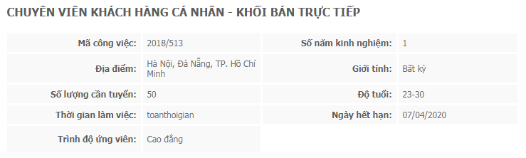 [li]Xây dựng và triển khai kế hoạch bán các sản phẩm cá nhân của ngân hàng (sản phẩm cho vay, thẻ tín dụng, tài khoản trả lương, tài khoản thanh toán) đảm bảo chỉ tiêu kinh doanh được giao[/li][li]Thực hiện các phương thức nâng cao hiệu quả bán hàng[/li][li]Phát triển khách hàng mới, tập trung vào các nghiệp vụ kinh doanh nhằm đạt chỉ tiêu cá nhân[/li][li]Quản lý và giám sát khách hàng Tín dụng sau khi giải ngân, nhắc nhở khách hàng trả nợ và lãi[/li][li]Hợp tác bán chéo sản phẩm[/li][/ul]