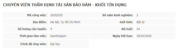 [li]Tốt nghiệp đại học các chuyên ngành về tài chính, ngân hàng, thẩm định giá, kinh doanh bất động sản/chứng khoán[/li][li]Hiểu biết/kiến thức về nghiệp vụ thẩm định giá, kinh doanh bất động sản và các nghiệp vụ về môi giới tài sản[/li][li]Kỹ năng lập kế hoạch và quản lý thực hiện kế hoạch: Khá[/li][li]Kỹ năng viết báo cáo: Tốt[/li][li]Kỹ năng phân tích: Tốt[/li][li]Kỹ năng làm việc độc lập, làm việc nhóm: Tốt[/li][li]Cẩn thận, chăm chỉ, có tinh thần trách nhiệm với công việc được giao[/li][/ul]