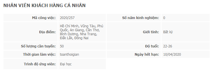 [li]Tốt nghiệp Đại học trở lên chuyên ngành Kinh tế, tài chính, ngân hàng hoặc tương đương[/li][li]Có kỹ năng giao tiếp, đàm phán, thuyết phục khách hàng tốt[/li][li]Có kinh nghiệm bán hàng, phát triển và chăm sóc khách hàng (là lợi thế)[/li][li]Ưu tiên ứng viên có cơ sở, mối quan hệ tốt với khách hàng (các tổ chức, doanh nghiệp, cá nhân…)[/li][/ul]