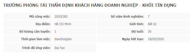 [li]Tốt nghiệp đại học (trở lên) chuyên ngành Kinh tế, Tài chính - ngân hàng, Kinh tế đầu tư, Kế toán – kiểm toán..[/li][li]Có tối thiểu 7 năm kinh nghiệm tín dụng Khách hàng doanh nghiệp trực tiếp; trong đó có tối thiểu 4 năm giữ vị trí Trưởng/Phó phòng Tái Thẩm định, Giám đốc/Phó Giám đốc các Đơn vị kinh doanh trực tiếp tại các Tổ chức tín dụng có chất lượng tín dụng tốt[/li][li]Có kỹ năng phân tích, tổng hợp và ra quyết định[/li][li]Có khả năng giao tiếp tốt, kỹ năng đàm phát và thuyết trình tốt, khả năng làm việc trong môi trường áp lực cao[/li][li]Trung thực, cầu thị, năng động, sáng tạo và chủ động trong công việc[/li][/ul]