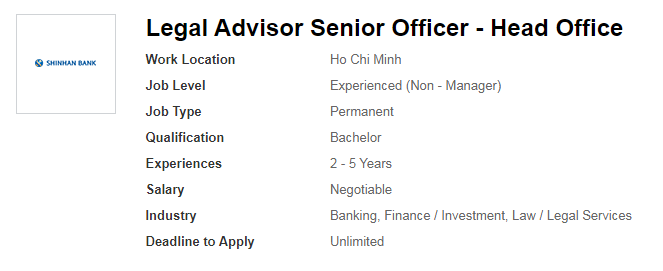 [li]Experience & knowledge in Banking industry at least 3 years[/li][li]Ability to identify areas of risk or weakness and suggest process of improvement[/li][li]Being accountable, detail-oriented, pro-active[/li][li]Ability to work both independently and in team environment[/li][li]Fluently in both English & Vietnamese (in both writing and presentation)[/li][li]Bachelor of law, law practitioner certificate is one preference[/li][/ul]